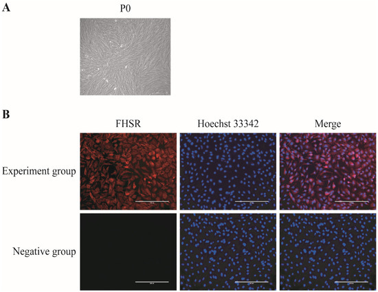 Isolation, culture, and identification of porcine GCs. (A) P0 generation granulosa cells were collected from porcine ovarian follicles for in vitro culture. Scale bar: 100 μm (B) Immunofluorescence staining for the granulosa cell-specific receptor FSHR was performed using the specific anti-FSHR for labeling in the control group. Scale bar: 200 μm.
