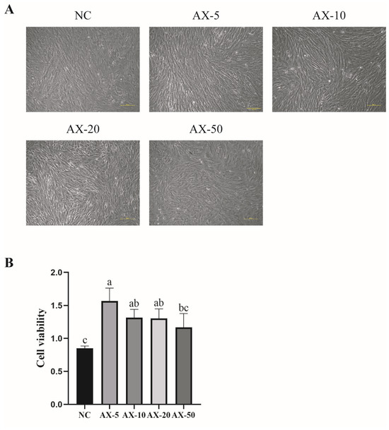 Effects of different concentrations of astaxanthin on the morphology and viability of porcine GCs. (A) Morphological changes in porcine GCs supplemented with astaxanthin at different concentrations. Scale bar: 100 μm. (B) The difference in granulosa cell activity in porcine with different concentrations of astaxanthin. Values: mean ± SEM; one-way ANOVA was used. Values with different letters are significantly different (p < 0.05). NC: Control group; astaxanthin was not added. AX-5: Treatment group; 5 μmol/L astaxanthin was added into the cell medium. AX-10: Treatment group; 10 μmol/L astaxanthin was added to the cell medium. AX-20: Treatment group; 20 μmol/L astaxanthin was added to the cell medium. AX-50: Treatment group; 50 μmol/L astaxanthin was added to the cell medium.