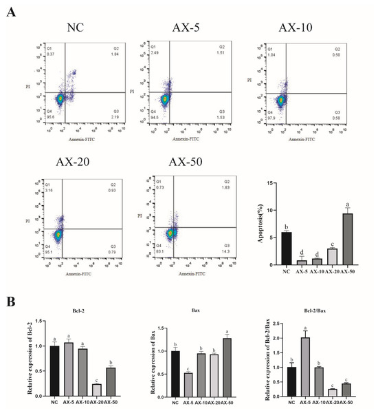 Astaxanthin has antioxidant, anti-apoptotic, and anti-inflammatory functions. In measuring the different concentration of AST of porcine GCs by flow cytometry, this in vitro study showed that the AX-5 was similar to AX-10 (p > 0.05) and significantly lower than other groups (Figure 5A), indicating the alleviation of porcine GCs’ apoptosis when astaxanthin is added. To further determine whether porcine GCs’ apoptosis was alleviated while cultured in vitro, we compared the ratio of Bcl-2/Bax to verify the changes in the expression levels of porcine GCs’ apoptosis-related genes. RT-PCR showed that the AX-5 Bcl-2 mRNA expression was similar to that of the NC and AX-10 groups (p > 0.05) and significantly higher in the other groups (p < 0.05); Bax mRNA expression was significantly lower in the other treatment groups (p < 0.05); the Bcl-2/Bax ratio was significantly higher in the other groups (p < 0.05) (Figure 5B).