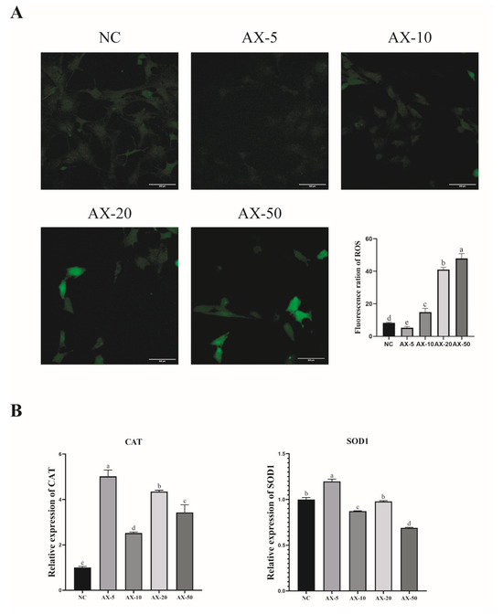 During the experimental study, we found that the ROS levels of porcine GCs significantly increased while being cultured in vitro. We added different concentrations of AST into the medium to verify whether AST would reduce the ROS level. The AX-5 group showed significantly lower ROS fluorescence intensity compared to the other treatment groups (p < 0.05) (Figure 6A). The effect of AST on antioxidants in porcine GCs was researched. After the porcine GCs were treated with AST, the AX-5 mRNA expression of antioxidant genes was significantly increased in the porcine GCs, including CAT and SOD1 (Figure 6B). In summary, the AX-5 group can promote the viability of porcine GCs, improve the proliferation ability, reduce intracellular ROS levels, and inhibit apoptosis. Consequently, subsequent experiments selected 5 μmol/L as the AST treatment group.