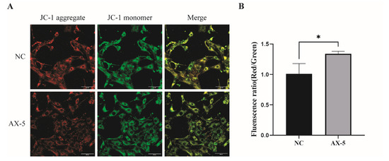 Mitochondrial membrane potential is a basic component of maintaining electrochemical potential during ATP synthesis. Our experiment found porcine GCs’ physiological state. We tested whether AST could improve mitochondrial activity and stabilize the state of porcine GCs in vitro. Then, the research measured the mitochondrial membrane potential of porcine GCs using the fluorescent probe JC-1 (Figure 7A). The red/green JC-1 signal ratio in the 5 μmol/L AST treatment group was significantly higher than that of other treatment groups (p < 0.05, Figure 7A), indicating that the AX-5 group improved mitochondrial activity and stabilized the physiological state of porcine ovarian granulose cells cultured in vitro.