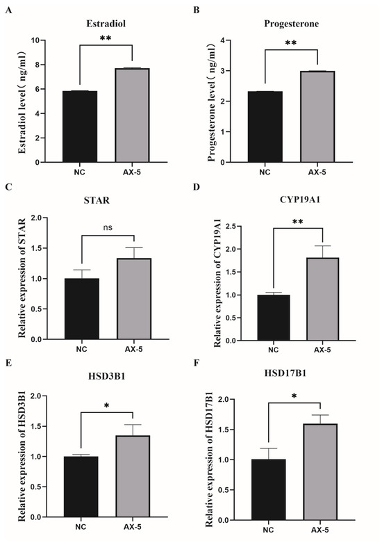 Hormone levels in the astaxanthin of porcine GCs. (A) The concentrations of estradiol in porcine GCs treated with astaxanthin. (B) The concentrations of progesterone in porcine GCs treated with astaxanthin. (C–F) E2 and P4 synthesis-related genes (STAR, CYP19A1, HSD3B1, HSD17B1) were expressed in porcine GCs treated with astaxanthin. All represent the mean ± SEM; a paired samples t-test was used. Asterisks indicate statistical significance between the two groups (ns: p > 0.05, * p < 0.05, ** p < 0.01).