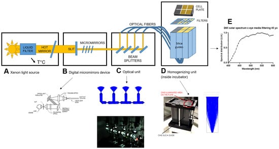 Tailored light set-up for simulating sunlight exposure at the retinal level. The light device consists of four units: (A) the lighting unit housing the light source; (B) the digital micromirror device which regulates both power and spectrum; (C) the optical unit separating the beam into four identical beams with the same optical power; and (D) the homogenizing unit. All units but the homogenizing unit are placed outside of the cell incubator to avoid heating and vibrations. The device enables exposure of a 96-well plate, divided into four sections of 16 wells each. Irradiance levels and homogeneity among the subdivision of the cell plate were monitored before and after each experiment, using a calibrated spectroradiometer. Additionally, light delivered by the custom-made device was continuously monitored using a calibrated photodiode. The current of the Xenon source was adjusted to stabilize the light level. The custom-made visible-light source can be spectrally adjusted to replicate the solar spectrum across 400–600 nm, weighted by eye media filtering (E).