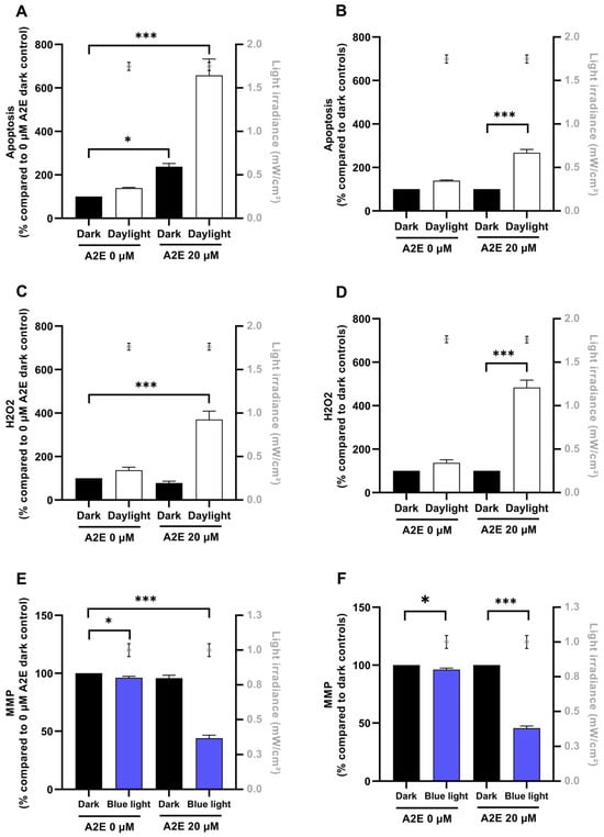 Evaluation of markers of cell damage in A2E-loaded cells exposed to simulated daylight. A2E-loaded RPE cells were exposed to simulated daylight at retinal level for 18 h before evaluation of apoptosis (n = 21 experiments; per experiment, 1 condition averaged on at least 12 wells). For each condition, applied light irradiances are expressed as mean +/− SEM in mW/cm2; with the grey symbol ο. (A,B), hydrogen peroxide (n = 8 experiments; per experiment, 1 condition averaged on at least 12 wells) (H2O2, C,D) and mitochondrial membrane potential (n = 4 experiments; 1 condition averaged on at least 12 wells) (MMP, E,F). Each marker was evaluated in darkness with and without A2E incubation and after light exposure in RPE cells incubated with 0 or 20 µM A2E. Data were either normalized to dark control with 0 µM A2E (A,C,D) or to dark control with 20 µM A2E (B,D,F). Data are expressed as mean +/− SEM. Two-way ANOVA with repeated measures and Tukey post hoc tests were used to compare variances between groups at each A2E concentration. Differences between sample and dark control were considered significant when p < 0.05 (*), or p < 0.001 (***).