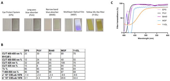 Five types of optical filters were designed: the Eye Protect SystemTM (EPS), a long-pass blue absorber (PUV), a narrow-band blue absorber (BA40), a Multilayer Optical Film (MOF), and a filter mimicking the transmittance of a yellow intraocular lens (Y-IOL) (Figure 2). These filters were characterized by the following parameters: blue-violet light reduction (BVC(B’) %), CUT_400–500 nm (%), reduction at 425 nm (%), reduction at 435 nm (%), Tv (%), T_460–500 nm (%), and a* and b* (Figure 2B).