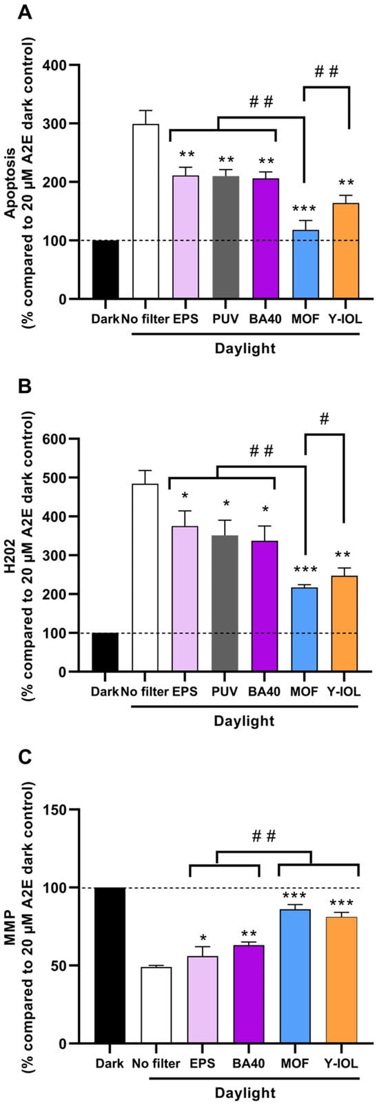 Photoprotection of filters in A2E-loaded cells exposed to simulated daylight. A2E-loaded RPE cells were exposed to simulated daylight at retinal level for 18 h without filter or with filter (EPS, PUV, BA40, MOF, or Y-IOL) before evaluation of apoptosis (A), hydrogen peroxide (H2O2, B), and mitochondrial membrane potential (MMP, C). Data are expressed as mean +/− SEM. Data are normalized to dark control with 20 µM A2E. One-way ANOVA with repeated measures and post hoc Dunnett unilateral test were used to compare variance of all light-exposed groups with filters to the light condition without filter at 20 µM of A2E. Differences between sample and light without filter were considered significant when p < 0.05 (*), p < 0.01 (**), or p < 0.001 (***). One-way ANOVA with repeated measures and Tukey post hoc tests were used to compare variances between light conditions with filters. Differences between filters were considered significant when p < 0.05 (#), or p < 0.01 (##).