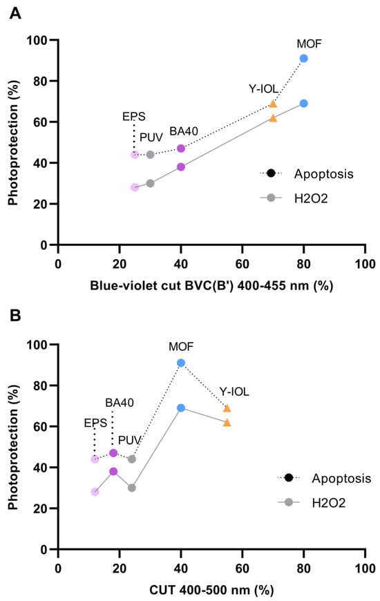 Photoprotection as a function of filtering properties. Photoprotection rates obtained with each filter against light-induced apoptosis (dotted lines in A,B) and H2O2 (gray lines in A,B) were plotted as a function of (A) their blue-violet reduction across 400–455 nm, expressed as BVC(B’), and (B) their average blue-light reduction across 400–500 nm. Each selective blue-violet filter is represented by a circle (EPS, PUV, BA40, and MOF), while Y-IOL is represented by a triangle to distinguish it as the only broadband filter. Each filter is depicted with a distinct color: EPS in light violet, PUV in gray, BA40 in vivid violet, MOF in blue, and Y-IOL in orange. (A) Increasing blue-violet reduction (400–455 nm) resulted in higher photoprotection, positioning MOF last after Y-IOL on the curves. (B) Conversely, an increasing average blue reduction (400–500 nm) did not consistently lead to increased photoprotection, as evidenced by MOF being positioned ahead of Y-IOL on the curve.