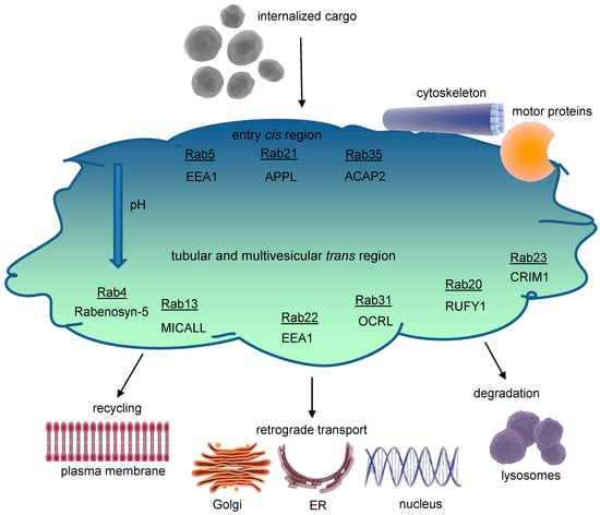- Naslavsky, N.; Caplan, S. The enigmatic endosome—Sorting the ins and outs of endocytic trafficking. J. Cell Sci. 2018, 131, jcs216499. [Google Scholar] [CrossRef]