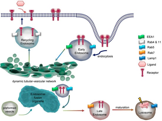 Internalization requires fusion of membrane cargo vesicles to organelles called endosomes (Figure 3). Those can be classified as early, sorting, recycling, or late endosomes depending on their stage of maturation [17,18]. Eventually lysosomes are considered to be part of the endosomal compartment [19]. As such, early endosomes function as signaling and scaffolding platforms to initiate or prolong distinct signaling pathways, or degradation of the internalized ligand and receptor. Accordingly, recognition of early endosomes as part of a degradation, signaling, or recycling pathway represents a major step in ligand-induced signal transduction.