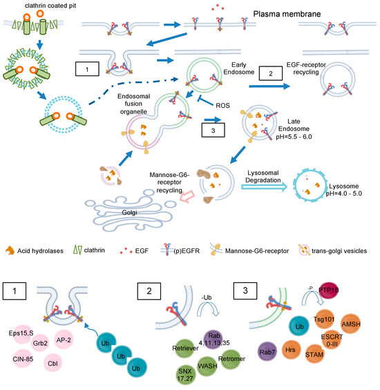 EGF and MG6 receptor trafficking in detail. Clathrin-mediated endocytosis of EGFR and intracellular trafficking of M6RR are shown. EGFR may be translocated to other cellular compartments like nucleoplasm or mitochondria (not depicted here). No claim to completeness of molecules is shown. (1) Recruitment of major adaptor proteins to EGFR during internalization. The activated receptor dimers are internalized by various pathways depending on ligand type and concentration. The adapter protein Grb2 recruits the ubiquitin ligase Cbl to EGFR, causing mono- or polyubiquitination. Multiple Ub-binding proteins interact with the ubiquitinated EGFR. (2) Association of recycling machinery. Association of Rab4,11,13,35 leads to direct or indirect recycling via the endosomal recycling complex. Deubiquitinating enzymes replenish the free Ub pool. (3) Lysosomal targeting of EGFR. Dephosphorylation of EGF receptor tyrosine kinases by PTPs terminates signaling and promotes the formation of intraluminal vesicles/multivesicular bodies. EGFR interaction with Hrs and recruitment of the ESCRT complex are necessary for the late endosomal–lysosomal route. AMSH = associated molecule with the SH3 domain of STAM; Cbl = Casitas B-lineage lymphoma protein; CIN-85 = Cbl-interacting protein; Eps= epidermal growth factor receptor substrate 15; ESCRT = endosomal sorting complex required for transport; Hrs = hepatocyte growth factor-regulated tyrosine kinase; PTP1B = Phosphotyrosinephosphatase 1 B; SNX = sorting nexin; STAM = signal transducing adaptor molecule Substrate; Tsg101 = tumor susceptibility gene 101; Ub = ubiquitin; WASH = Wiskott–Aldrich syndrome protein and SCAR homolog.