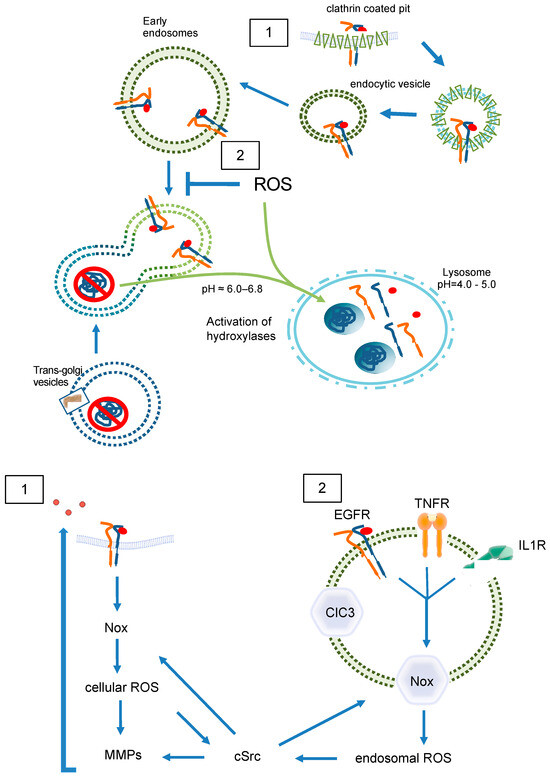 In the case of the EGF/EGFR, NADPH oxidases may only play a role in transactivation of the receptor (Figure 5(1)) [59,60]. For its endosomal signaling, quiescin sulfhydryl oxidase 1 (QSOX1) has been identified as a cellular pro-oxidant, which accelerates ubiquitination-mediated degradation of EGFR and its intracellular endosomal trafficking in hepatocellular carcinoma (HCC) cells [61]. The longer version of human QSOX1 protein (hQSOX1a) is a transmembrane protein localized primarily to the Golgi apparatus [62], while QSOX1b lacks the transmembrane helix and therefore is soluble, secreted, and accumulates in extracellular fluids [63]. Importantly, the enzyme produces H2O2 that can reduce thiols in proteins and forms disulfides. Another reactive oxygen species is the superoxide anion (•O2ˉ). It was suggested that •O2ˉ and Clˉ are transported through DIDS-sensitive chloride channel(s) out of early endosomes, where •O2ˉ is converted into H2O2 by superoxide dismutase (SOD1). H2O2 then enables further signaling outside of the endosome [64]. Such mechanisms would define endosomes as internal sources of ROS and suggest •O2ˉ-formation to occur within endosomes. Both cellular and endosomal ROS activate c-Src and matrix metalloproteases (MMP) followed by ligand shedding of EGFR ligands. This EGFR trans-activation leads as a feed-forward mechanism to further ROS creation by Nox. As a result, specific signals are generated for proliferation, neointima formation, etc. [65,66].