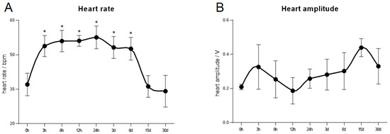 Heart rate and amplitude of C. farreri under different heat stress time. (A) Heart rate (HR); (B) Heart amplitude (HA). The circle shape represents the mean ± S.D. (n = 3). (* p value < 0.05).