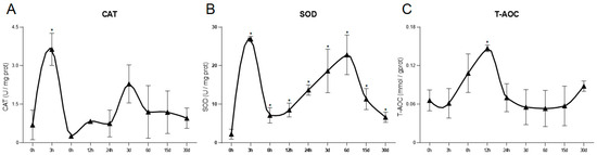 Catalase (CAT) activity, superoxide dismutase (SOD) activity, and total antioxidant capacity (T-AOC) of the heart were detected for each sample point (n = 3, respectively). The stored heart tissues were mixed with saline solution to create a 10% tissue homogenate for enzyme activity measurement. The CAT, SOD, and T-AOC enzyme activities were determined following the manufacturer’s instructions of commercial kits (Nanjing Jiancheng Bioengineering Institute, Nanjing, China, cat. No. A007-1-1, cat. No. A001-3-2 and cat. No. A015-3-1). The reaction temperature of CAT, SOD, and T-AOC kits are 37 °C. The CAT activity was determined on the basis of the ammonium molybdate method [31]; the SOD activity was measured using the WBT-1 method [32]; and the T-AOC activity was estimated through the FRAP method [33].
