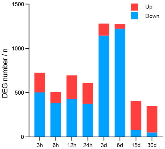 Numbers of DEGs in heart of C. farreri under heat stress. Red bar represents the number of up-regulated DEGs; blue bar represents the number of down-regulated DEGs.