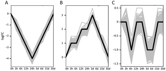 Three expression trends of DEGs in heart of C. farreri under heat stress. (A) Expression trend contrary to the trend observed in HR changes; (B) expression trend similar to the trend of HR; (C) expression trend opposite to the trend of HA changes. The X-axis represents the time of heat stress. The Y-axis represents the log2FC of gene expression change.