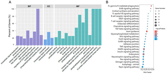 The GO and KEGG analysis of DEGs in heart of C. farreri under heat stress. (A) GO annotation. The X-axis represents the annotated functions. The Y-axis represents the percent of enriched gene numbers. (B) KEGG enrichment. The X-axis represents the rich factor of KEGG terms. The Y-axis represents the enriched pathways. The circle shape represents the number of DGEs in the enriched pathways.