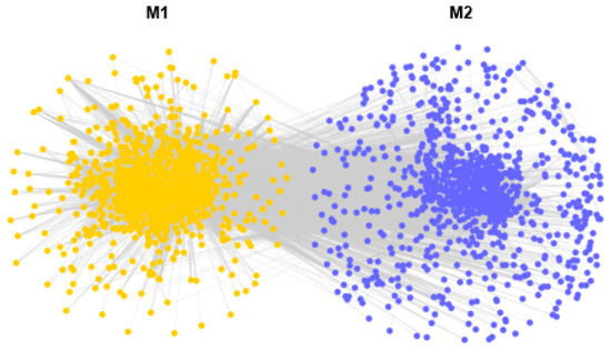 Main response modules of WGCNA network of heart after heat treatment. Yellow dots belong to M1 and blue dots belong to M2.