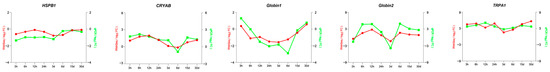 To verify the accuracy of transcriptome sequence data, a total of five genes, Heat shock protein beta-1 (HSPB1), Crystallin alpha B (CRYAB), Globin1, Globin2, and Transient receptor potential cation channel subfamily A member 1 (TRPA1) were randomly selected for RT-qPCR (Figure 9). RT-qPCR results (green line) of these genes were consistent with RNA-Seq results (red line), indicating the high reliability of the transcriptome.