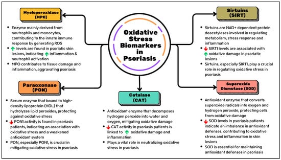 In this regard, biomarkers originating from mtROS represent promising novel directions in understanding psoriasis. These biomarkers are poised to become pivotal players in deciphering the intricate interplay between mitochondrial dysfunction, oxidative stress, and psoriasis pathogenesis. Their significance in the pathophysiology of psoriasis will be elucidated through comprehensive analyses spanning preclinical and clinical studies. Noteworthy biomarkers such as myeloperoxidase (MPO), paraoxonase (PON), sirtuins (SIRTs), superoxide dismutase (SOD), and catalase (CAT) are emerging as key indicators of psoriasis pathogenesis and their association with mitochondrial ROS. Through continued investigation and validation, these biomarkers hold the potential to revolutionize the diagnosis, prognosis, and management of psoriasis, paving the way for more targeted and personalized therapeutic approaches. The summary of oxidative stress biomarkers in psoriasis inflammation is displayed in Figure 1.
