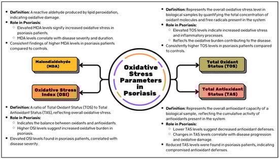 Overview of oxidative stress parameters in psoriasis inflammation. This figure provides a summary of key oxidative stress parameters associated with psoriasis. It depicts the roles of malondialdehyde (MDA), total antioxidant status (TAS), oxidative stress index (OSI), and total oxidant status (TOS) in evaluating oxidative stress and antioxidant defense mechanisms in psoriasis patients.