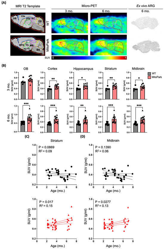 We first sought to determine whether O2•− is a key trackable signal of neuroinflammation in the MitoPark mouse model of PD. In this model, mitochondrial dysfunction is induced in dopaminergic (DA) neurons by the selective deletion of Tfam, which results in progressive degradation of the nigrostriatal DA axis and parkinsonian symptoms that become fatal by 7 months of age [13]. To quantify oxidative stress in vivo, we compared [18F]ROStrace retention in the whole brain of age-matched WT and MitoPark mice using micro-PET/CT (Inveon, Siemens Medical Solutions, Inc., Malvern, PA, USA). MitoPark mice exhibited increased whole-brain [18F]ROStrace retention as early as 2 months of age (n = 11, p = 0.0167), with this increase persisting from 3 months to 6 months of age (n = 15, p = 0.0013) (Figure 1A, middle panel). To validate these PET findings, we performed ex vivo autoradiography (ARG) using [18F]ROStrace, which confirmed elevated signals in the whole brain of MitoPark mice compared to WT (Figure 1A, left panel). Next, we applied the Mirrione mouse brain atlas (Figure 1A, right panel) to our PET data to assess [18F]ROStrace retention in specific brain subregions, focusing on regions either housing DA neurons (olfactory bulb, midbrain) or influenced by the nigrostriatal DA system (cortex, hippocampus, striatum). Our results show that [18F]ROStrace retention was increased in the cortex, striatum and midbrain of 3-month-old MitoPark mice (Figure 1B, 3 months), compared to WT. [18F]ROStrace signal was further elevated and widespread to the brain regions most associated with the dopaminergic pathway in the 6-month-old MitoPark mice (Figure 1B). To further explore the relationship between [18F]ROStrace retention and age, we performed linear regression analyses for the whole brain, striatum (Figure 1C), and midbrain (Figure 1D) SUVs in aging MitoPark mice. These analyses revealed a positive correlation between [18F]ROStrace SUV and age in whole brain (p = 0.0067, R2 = 0.2) as well as nigrostriatal brain regions of MitoPark mice (Figure 1C,D), but not in WT controls (WT whole brain, p = 0.0603, R2 = 0.1).