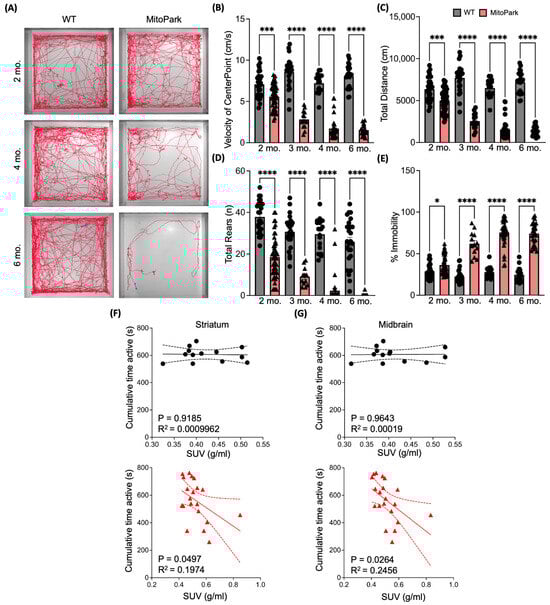 Progressive decline of motor function in MitoPark mice. Representative images (A) showing the progressive reduction in distance traveled by MitoPark (right panel) compared to WT (left panel) within 15 min at 2–6 months of age. Quantitative analysis revealed a progressive decrease in motor function determined by reduced velocity (B), total distance traveled (C), number of rears (D), and increased time immobile (E) during the 15 min test. Values represent mean ± SEM, n = 15–47 per group. p values of MitoPark vs. WT determined by two-way ANOVA with mixed effects model followed by Tukey’s post-test (* p < 0.05; *** p < 0.001; **** p < 0.0001). (F,G) Linear regression analysis of WT (black dots, n = 13) and MitoPark (red triangles, n = 23) of cumulative time in activity vs. Striatum (F) and Midbrain (G) [18F]ROStrace SUV.