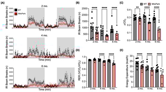 Next, movement and metabolism of MitoPark mice were continuously monitored in the home cage environment via the Comprehensive Lab Animal Monitoring System (CLAMS; Columbus Instruments, Columbus, OH, USA). The results again highlighted the progressive nature of the MitoPark phenotype, with significant deterioration of activity (Figure 3A,B), whole body respiration (ΔCO2; Figure 3C) and the respiratory exchange ratio (RER; Figure 3D) from 2 to 6 months of age. Similarly, whole-body energy expenditure (kcal/h) in the MitoPark mice was also decreased (Figure 3E) over time. Together, these findings indicate that early detection of oxidative stress via [18F]ROStrace can predict the progressive deterioration of motor function in the MitoPark model.