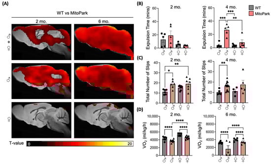 Growing clinical evidence indicates that males are more susceptible to developing PD than females [31,32], which may be partially explained by higher oxidative stress and lower mitochondrial function in males [33]. Consistent with this, multiple PD animal models also reveal that males develop parkinsonian symptoms (rigidity, bradykinesia, and postural instability) sooner than females [34,35]. Therefore, we hypothesized that MitoPark mice may also demonstrate a male sex bias that is detectable by [18F]ROStrace imaging. To test this hypothesis, statistical parametric mapping (SPM) was used to distinguish brain regions with elevated [18F]ROStrace signal in MitoPark relative to WT in both sexes (Figure 4A). The SPM analysis revealed that regional differences between the two genotypes were largely driven by the male sex (Figure 4A). Importantly, the brain regions showing increased [18F]ROStrace retention in males were key dopaminergic areas, such as the olfactory bulb (OB), striatum and midbrain. Since MitoPark males showed significant differences from WT at a young age (2 months), we sought to determine if male MitoPark mice also show greater changes in behavior related to prodromal PD. Gastrointestinal motility and fine motor coordination were previously shown to be impaired in the “prodromal” stage of rodent PD models [22,36]. Thus, we employed the bead expulsion and tapered beam assays to investigate sex differences in gastrointestinal motility and fine motor coordination, respectively. Young MitoPark males exhibited reduced gut motility (Figure 4B) and impaired fine motor coordination (Figure 4C) compared to WT, whereas female MitoPark were indistinguishable from WT (Bead: 2 months, p = 0.9912; 4 months, p = 0.6644; Beam: 2 months, p = 0.1348; 4 months, p = 0.2279). Both male and female aged MitoPark mice were unable to complete these behavioral tasks due to the advanced PD-like phenotype at 6 months of age. However, when the intrinsic stress associated with these tests was eliminated and the mice were observed at baseline in their home cage environment, male MitoPark mice had the lowest whole-body oxygen consumption (VO2) at both the early (2 months) and end (6 months) stages of disease (Figure 4D), indicating more severe metabolic symptoms throughout the disease course. Collectively, these results show that [18F]ROStrace effectively identifies the male sex bias in the PD-like phenotype of MitoPark mice.