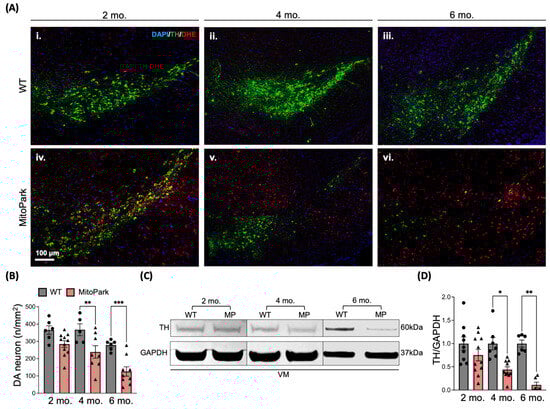 Increased DHE signal in the substantia nigra (SN) accompanied by progressive loss of DA neurons in MitoPark mice. (A(i–vi)) Representative coronal images of the SN from WT (A(i–iii)) and MitoPark (A(iv–vi)) mice at 2–6 months of age showing increased DHE signal and decreased tyrosine hydroxylase (TH)-positive neurons in the MitoPark SN. Scale bar = 100 µm. (B) Quantification of TH-positive neurons in the SN of age-matched WT and MitoPark mouse brain tissues. Values represent mean ± SEM, n = 5–11 per group, p values of MitoPark vs. WT determined by two-way ANOVA followed by Tukey’s post-test. ** p < 0.01, *** p < 0.001. Western blots confirmed decreased TH in the SN (C,D) of MitoPark mice at 4–6 months of age, n = 6–11 per group, values represent mean ± SEM. p values determined by two-way ANOVA with mixed effects model followed by Tukey’s post-test. * p < 0.05; ** p < 0.01.