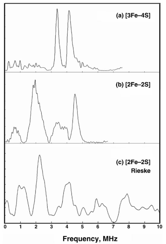 X-band ESEEM spectroscopy illustrates (a) the [3Fe–4S] cluster in fumarate reductase from E. coli; (b) the [2Fe–2S] ferredoxin from A. platensis; (c) the Rieske protein in bovine heart mitochondria. Adapted from [].
