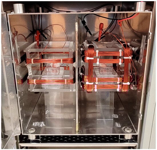 Following the protocol by Vuckovic et al. [], the MF exposure apparatus was constructed and calibrated using commercially available materials. This setup enabled reliable and reproducible investigation of MF effects on biological samples. Uniform magnetic fields were generated using square Helmholtz coils with 30 turns each. One set of Helmholtz coils was used for the exposed cultures, while another served as the control. Control cells were maintained under an SMF of 45 µT, which approximates the Earth’s magnetic field in Boulder, Colorado, ensuring that the cells were exposed to a natural magnetic environment. Treated cells were subjected to both an SMF of 45 µT and varying RF fields. Both the SMF and RF magnetic fields were oriented vertically relative to the culture flasks or well plates. The coils were wound with 1.63 mm wire to address heating issues and maintain a stable temperature close to 37 °C. The dimensions of the coils (side = 15 cm) were selected to accommodate the culture flasks and well plates adequately. Figure 3 shows the experimental setup, including a detailed configuration of Helmholtz coils within the mu-metal cage.
