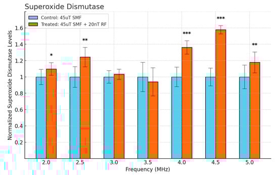 Figure 4 illustrates the normalized levels of SOD when exposed to a 45 μT SMF alone and in combination with a 20 nT RF field across different frequencies. At 4.5 MHz, the treated group showed the highest increase in SOD levels (p < 0.001). These findings suggest that SOD levels are significantly influenced by the combined exposure to SMF and RF fields, particularly at certain frequencies.