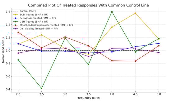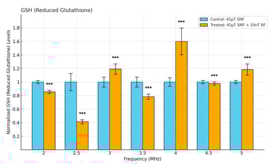 The normalized levels of GSH in response to exposure to a 45 μT SMF alone and in combination with a 20 nT RF field across different frequencies are shown in Figure 5. Significant changes were observed in GSH levels at several frequencies. At 2.5 MHz, a significant reduction was noted (p < 0.001). Conversely, at 4 MHz, the treated groups exhibited substantial increases in GSH levels compared to the control groups (p < 0.001). These results indicate a frequency-dependent response in GSH levels to combined SMF and RF field exposure.