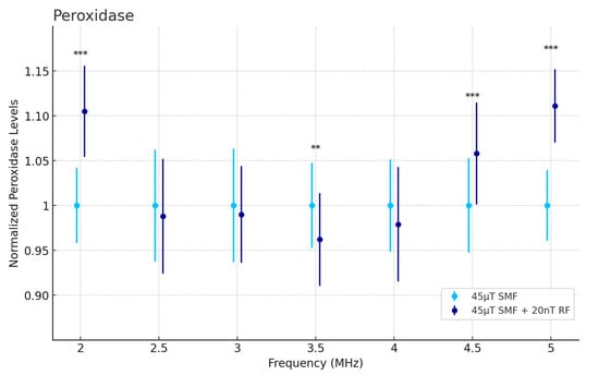 Figure 6 presents the normalized peroxidase levels under the influence of a 45 μT SMF alone and combined with a 20 nT RF field. At 2 MHz, 4.5 MHz, and 5 MHz the control group showed significantly higher peroxidase levels compared to the treated group (p < 0.001). The peroxidase levels generally exhibited less variation compared to GSH levels, suggesting a more stable response to magnetic field exposure.