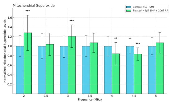 In our study, mitochondrial superoxide levels were assessed using the MitoSOX Red indicator, a fluorogenic dye selectively targeted to mitochondria, where it is rapidly oxidized by superoxide to exhibit red fluorescence. Cells exposed to various RF frequencies (ranging from 2 MHz to 5 MHz) under an SMF of 45 μT and a 20 nT RF field exhibited frequency-dependent changes in mitochondrial superoxide levels. As shown in Figure 7, mitochondrial superoxide levels were significantly reduced at 4.5 MHz compared to the control group (p < 0.001). Conversely, at 2 MHz, a significant increase in superoxide production was observed (p < 0.001). At 3.5 and 5 MHz, the superoxide levels in the treated group were slightly elevated compared to the control, but the effect was not as pronounced as at 2 MHz. These findings suggest that hyperfine resonance effects may differentially modulate mitochondrial superoxide production depending on the applied RF frequency. This frequency-specific modulation aligns with the hypothesis that weak RF fields influence mitochondrial ETC components through hyperfine interactions, altering superoxide generation.