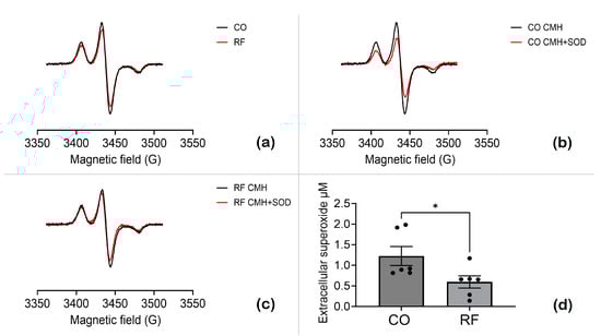 Extracellular superoxide levels in HT-1080 cells exposed to magnetic fields. CO refers to cells exposed to a 45 µT SMF, while RF indicates cells exposed to a 45 µT SMF combined with a 20 nT RF field at 4 MHz. (a) EPR spectra of CO cells (black trace) and RF-exposed cells (red trace). (b) EPR spectra of CO cells with (red) or without (black) pretreatment with SOD1. (c) EPR spectra of RF-exposed cells, with (red) or without (black) pretreatment with SOD1. The CM● concentration was determined by double integration, followed by analysis using SpinCount. (d) SOD-inhibitable signal reflecting extracellular superoxide levels. Data are expressed as mean ± SEM; * p < 0.05 represents significant difference.