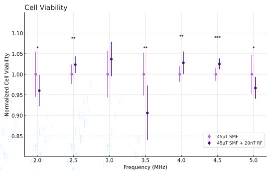 At an applied RF field intensity of 20 nT, our conclusions align with a broader body of evidence suggesting that low-intensity electromagnetic fields exert biological effects through non-thermal mechanisms []. Furthermore, concerns have been raised about the impact of RF field intensities below current safety standards, particularly for sensitive populations. While current exposure standards are primarily based on avoiding thermal effects, increasing evidence indicates that non-thermal influences of RF fields can modulate oxidative stress, ROS production, and other cellular processes []. Such findings call attention to the importance of re-evaluating these standards.