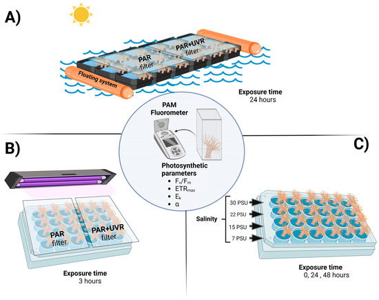 Experimental design for A. hermaphroditica exposed in a floating system to a daily cycle of light (PAR and PAR+UVR) and tide in the field during a 24 h period in the Quempillén estuary (A); short term exposure to experimental radiation (PAR and PAR+UVR) (B); and experimental salinities (C) under laboratory conditions. Photosynthetic parameters were assessed in all experimental animals using a portable fluorometer. Figure created using BioRender.com.