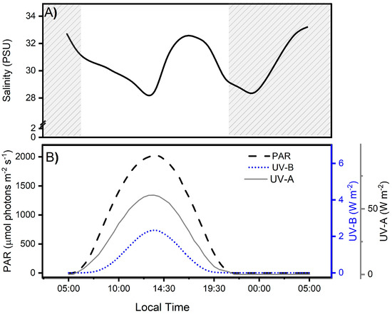 Salinity levels (A) and solar irradiance during the experimental period (B), separated for photosynthetically active (PAR: 400–700 nm), ultraviolet-B (UV-B: 280–315 nm), and ultraviolet-A (UV-A: 315–400 nm) radiation (B) in the Quempillén River estuary (41°52′ S; 73°46′ W) during a 24 h period for a clear spring-summer day (December 2022). The gray area corresponds to hours of the day without light.