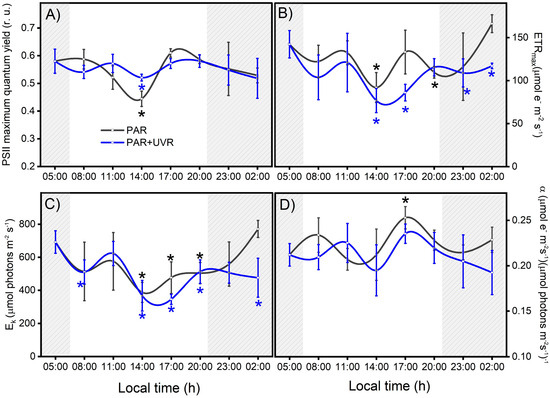 Variation in photosynthetic activity in the symbiotic complex A. hermaphroditica/P. anthopleurum exposed to PAR (gray line) and PAR+UVR (blue line) radiation treatments. The parameters correspond to PSII maximal quantum yield for electron transport (A), the maximal photosynthetic electron transport rate (B), the photosynthetic efficiency (C), and the light saturation index (D) during a daily light–tide cycle. The gray area corresponds to hours of the day without light. These Chl-a fluorescence parameters were calculated from the P–I light saturation curve. Data are presented as mean ± standard deviation (n = 3). Asterisks above or below the data points indicate a statistical difference compared to baseline p ˂ 0.05), in black or blue for PAR or PAR+UVR, respectively.
