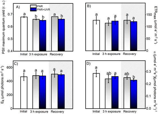 Change in photosynthetic activity, indicated by the PSII maximal quantum yield for electron transport (A), the maximal photosynthetic electron transport rate (B), the photosynthetic efficiency (C), and the light saturation index (D). These Chl-a fluorescence parameters were calculated from the P–I light saturation curve in control A. hermaphroditica adults and in individuals exposed for 3 h to PAR (blue bars) and PAR+UVR (gray bars) conditions and then recovery in darkness for 3 h (coarse area). Data are presented as mean ± standard deviation (n = 3). Letters above bars represent statistically significant differences between groups as determined by ANOVA and Tukey’s HSD tests (p ˂ 0.05).