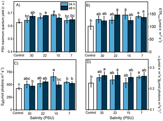 Change in photosynthetic activity of the symbiotic complex A. hermaphroditica/P. anthopleurum, indicated by the PSII maximal quantum yield for electron transport (A), the maximal photosynthetic electron transport rate (B), the photosynthetic efficiency (C), and the light saturation index (D). These Chl-a fluorescence parameters were calculated from the P–I light saturation curve in control organisms exposed during 24 h (light blue bars) and 48 h (dark blue bars) to experimental salinities (30, 22, 15 and 7 PSU). Data are presented as mean ± standard deviation (n = 3). Letters above bars represent statistically significant differences between groups as determined by ANOVA and Tukey’s HSD tests (p < 0.05).