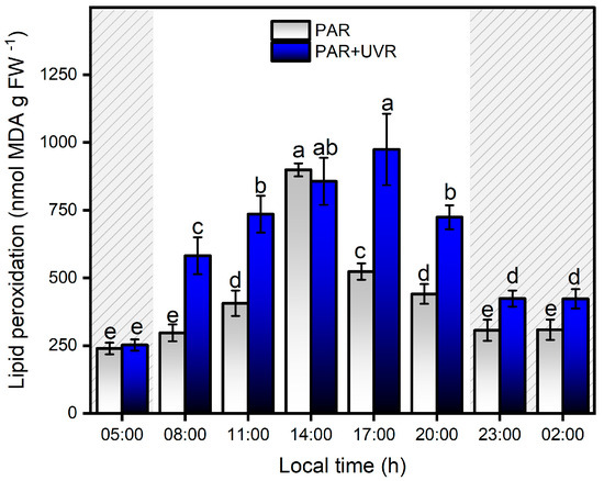 Levels of lipid peroxidation levels in the symbiotic complex A. hermaphroditica/P. anthopleurum exposed to PAR (blue bars) and PAR+UVR (gray bars) during a daily light/tidal cycle in the Quempillén estuary throughout a 24 h period. Coarse area corresponds to hours of the day without light (night period). Data are presented as mean ± standard deviation (n = 6). Letters above bars represent statistically significant differences between groups as determined by ANOVA and Tukey’s HSD tests (p < 0.05).