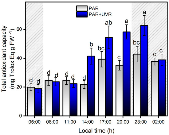 Total antioxidant capacity levels in the symbiotic complex A. hermaphroditica/P. anthopleurum exposed to PAR (blue bars) and PAR+UVR (gray bars) during a daily light/tidal cycle in the Quempillén estuary through a 24 h period. Coarse area corresponds to hours of the day without light (night period). Data are presented as mean ± standard deviation (n = 6). Letters above bars represent statistically significant differences between groups as determined by ANOVA and Tukey’s HSD tests (p < 0.05).