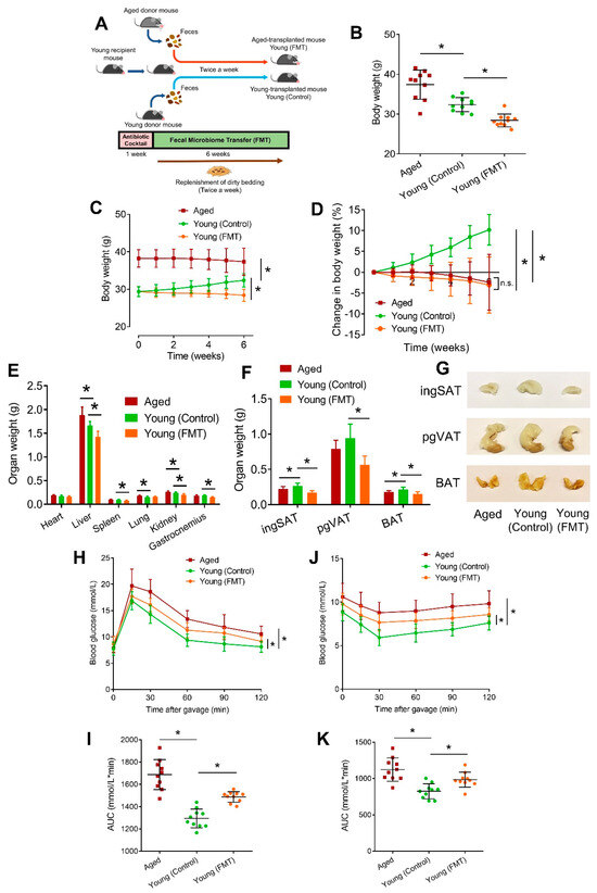 Effects of aged-to-young FMT on body parameters. (A) Schematic overview on FMT protocol from aged and young donor mice to young recipient mice. (B) Body weights of aged donor mice (Aged), young-transplanted (Young (Control)) and aged-transplanted young mice (Young (FMT)) after 6-week FMT protocol. (C) Body weight changes and (D) percentage changes in body weights of mice in (B) during the 6-week FMT. (E) Weights of indicated organs of mice in (B) postmortem after the 6-week FMT. (F) Weights of inguinal subcutaneous adipose tissue (ingSAT), perigonadal visceral adipose tissue (pgVAT) and brown adipose tissue (BAT) of mice in (B). (G) Gross appearance of adipose tissues of mice in (B). (H) Glucose tolerance test (GTT) on mice in (B) at week 6 of FMT, and (I) corresponding area under curve (AUC) analysis of glucose over time. (J) Insulin tolerance test (ITT) of mice in (B) at week 6 of FMT, and (K) corresponding AUC analysis of glucose over time. N = 10 per group. Data are mean ± SD. * p < 0.05; Brown-Forsythe and Welch ANOVA and Dunnett T3 test.