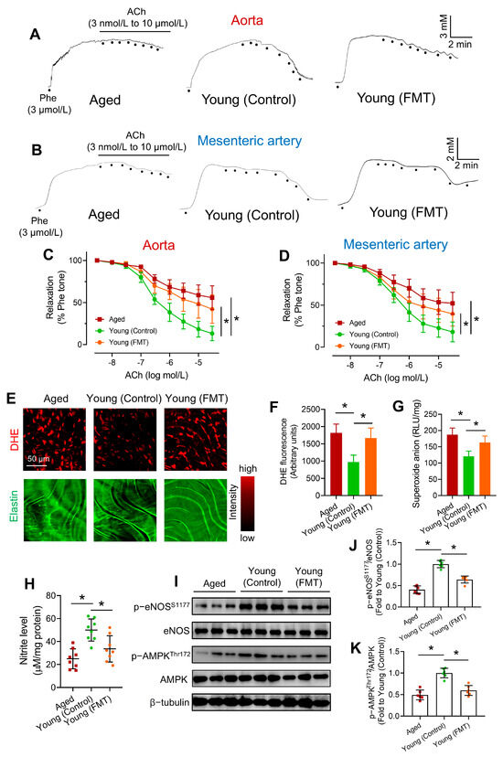 Effects of aged-to-young FMT on endothelial function. Representative traces for endothelium-dependent relaxations (EDRs) in (A) aortas and (B) mesenteric arteries of Aged, young-transplanted (Young (Control)) and aged-transplanted mice (Young (FMT)). Summary statistics of wire myography on EDRs in (C) aortas and (D) mesenteric arteries from different mouse groups. (E) Dihydroethidium (DHE) staining on en face endothelium of different mouse groups, and (F) corresponding quantification of DHE fluorescence. (G) Lucigenin-enhanced chemiluminescence on aortic ROS levels of different mouse groups. (H) Nitrite levels in aortas of different mouse groups. N = 8 per group. (I) Representative Western blots, and (J,K) quantification of Western blotting on expression of AMPK, p-AMPK at Thr172, eNOS and p-eNOS at Ser1177 in aortas of different mouse groups. N = 6 per group. Data are mean ± SD. * p < 0.05; Brown-Forsythe and Welch ANOVA and Dunnett T3 test.