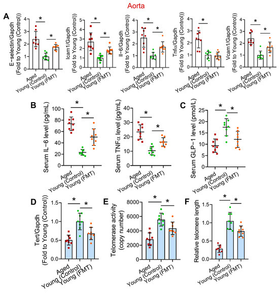 Effects of aged-to-young FMT on vascular and systemic inflammation, and vascular telomere function. (A) RT-PCR on mRNA levels of pro-inflammatory genes in aortas of Aged, young-transplanted (Young (Control)) and aged-transplanted mice (Young (FMT)). (B) ELISA on circulating inflammatory markers of different mouse groups. (C) ELISA on circulating GLP-1 levels of different mouse groups. (D) Tert mRNA level in aortas of different mouse groups. (E) Telomerase activities in aortas of different mouse groups. (F) Relative telomere length in aortas of different mouse groups. N = 8 per group. Data are mean ± SD. * p < 0.05; Brown-Forsythe and Welch ANOVA and Dunnett T3 test.