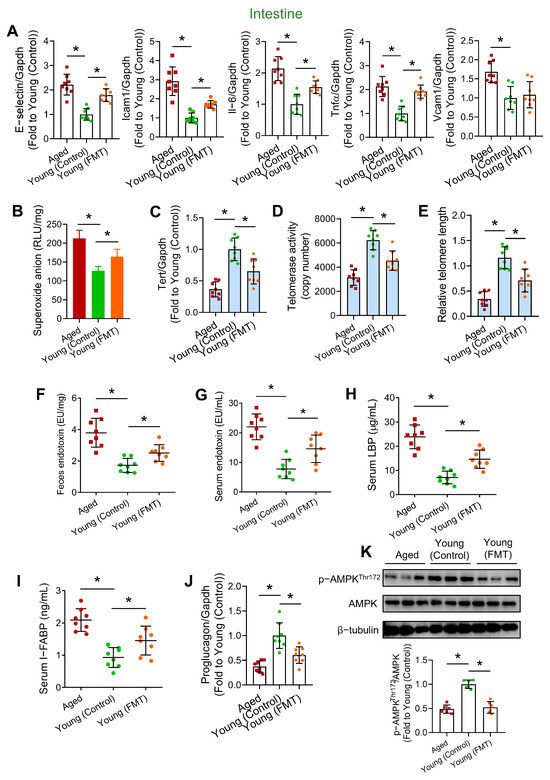 Effects of aged-to-young FMT on intestinal inflammation, telomere function and barrier function. (A) RT-PCR on mRNA levels of pro-inflammatory genes in intestines of Aged, young-transplanted (Young (Control)) and aged-transplanted mice (Young (FMT)). (B) Lucigenin-enhanced chemiluminescence on intestinal ROS levels of different mouse groups. (C) Tert mRNA level in intestines of different mouse groups. (D) Telomerase activities in intestines of different mouse groups. (E) Relative telomere length in intestines of different mouse groups. Endotoxin levels in (F) feces and (G) sera of different mouse groups. ELISA on serum levels of (H) LBP and (I) I-FABP of different mouse groups. (J) Proglucagon mRNA level in intestines of different mouse groups. N = 8 per group. (K) Representative Western blots and quantification of Western blotting on expression of AMPK and p-AMPK at Thr172 in intestines of different mouse groups. N = 6 per group. Data are mean ± SD. * p < 0.05; Brown-Forsythe and Welch ANOVA and Dunnett T3 test.