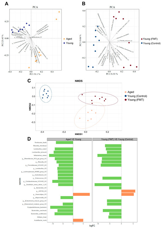 Effects of aged-to-young FMT on gut microbial profiles in young host mice. (A) Principal component analysis (PCA) plot revealing distinct clusters for fecal microbiome samples obtained from young (depicted in blue) and aged (in brown) mice before antibiotic treatment and FMT, highlighting the species contributing to this clustering. N = 8 per group. (B) PCA plot showing the clustering of fecal microbiome samples from young-transplanted (Young (Control); depicted in blue) and aged-transplanted mice (Young (FMT); in red). N = 8 per group. (C) Non-Metric Multi-Dimensional Scaling (NMDS) plot displaying the clustering of microbiome across various mouse groups. N = 6–8 per group. (D) Differential abundance analysis on the mean difference in centered log ratio for enriched species in young, aged, Young (Control) and Young (FMT) mice. N = 8 per group.