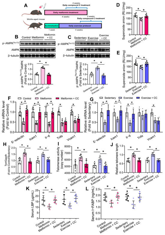Effects of chronic metformin treatment and moderate exercise training on intestinal homeostasis. (A) Schematic diagram on chronic metformin treatment and moderate exercise training with the presence and absence of compound C (CC) treatment in middle-aged C57BL/6 mice. Representative Western blots and quantification of Western blotting on expression of AMPK and p-AMPK at Thr172 in intestines of (B) metformin-treated mice, and (C) exercise-trained mice. Lucigenin-enhanced chemiluminescence on intestinal ROS levels of (D) metformin-treated mice, and (E) exercise-trained mice. RT-PCR on mRNA levels of pro-inflammatory genes in intestines of (F) metformin-treated mice, and (G) exercise-trained mice. (H) Tert mRNA level in intestines of different mouse groups. (I) Telomerase activities in intestines of different mouse groups. (J) Relative telomere length in intestines of different mouse groups. ELISA on serum levels of (K) LBP and (L) I-FABP of different mouse groups. N = 6 per group. Data are mean ± SD. * p < 0.05; Brown-Forsythe and Welch ANOVA and Dunnett T3 test.